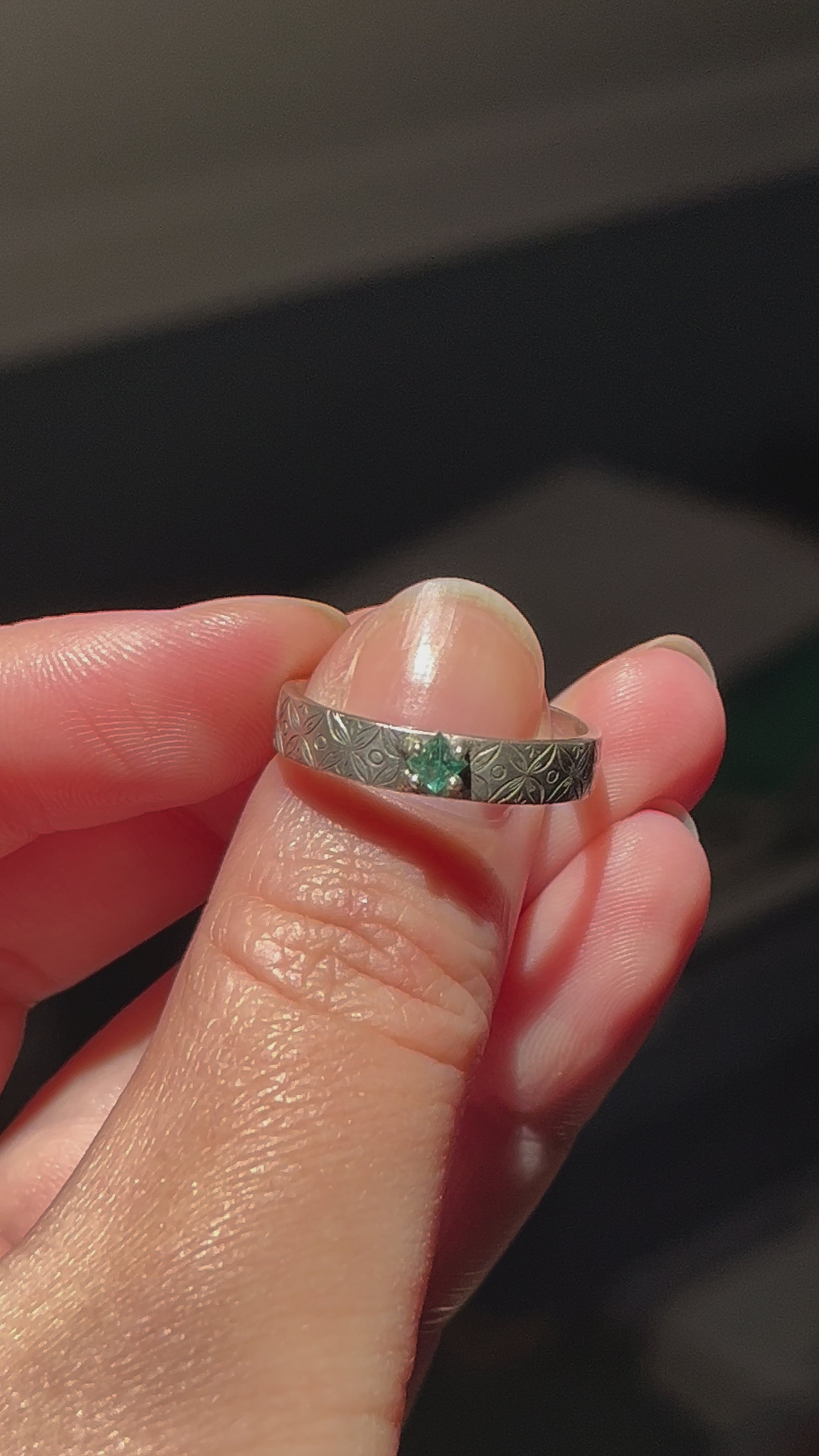 Banda de plata 950 grabada 100% a mano y decorado con una piedra como corona. Puedes elegir entre esmeralda o iolita.
