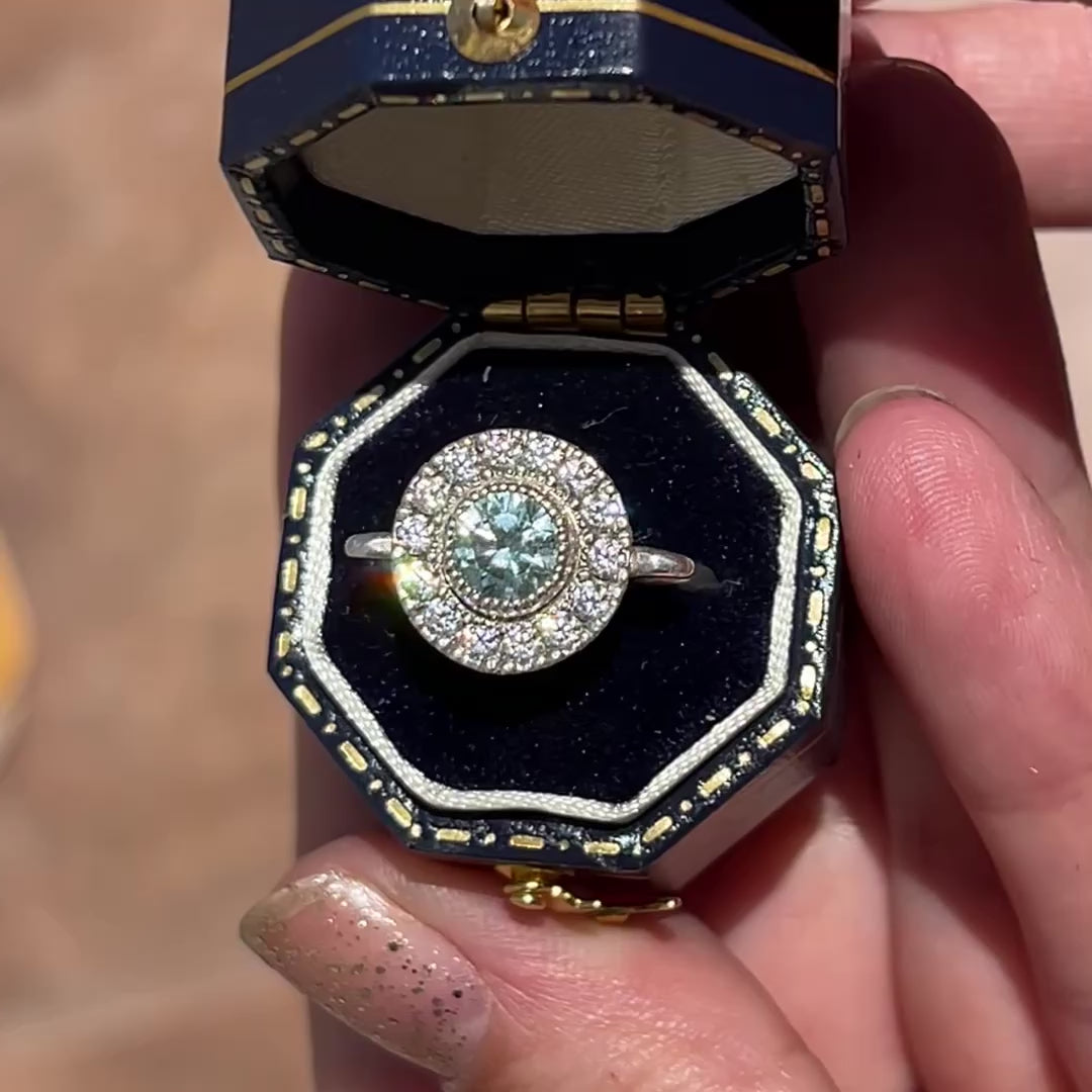 Modelo clásico, confeccionado en Plata 950, con un halo de 14 cristales Swarovski de 2 mm y un cristal como pieza central de 6 mm de diámetro.