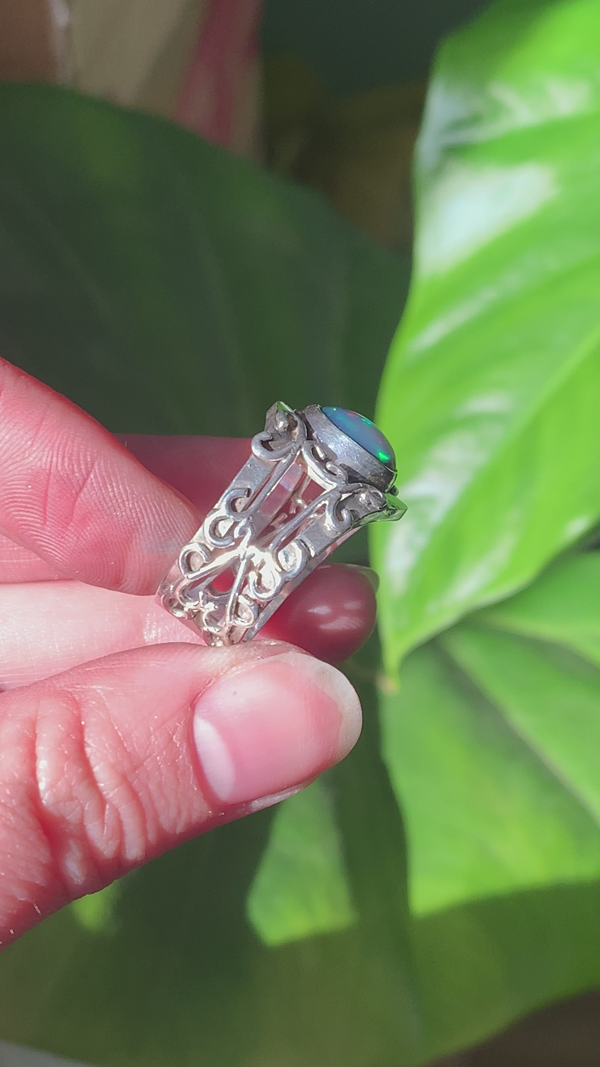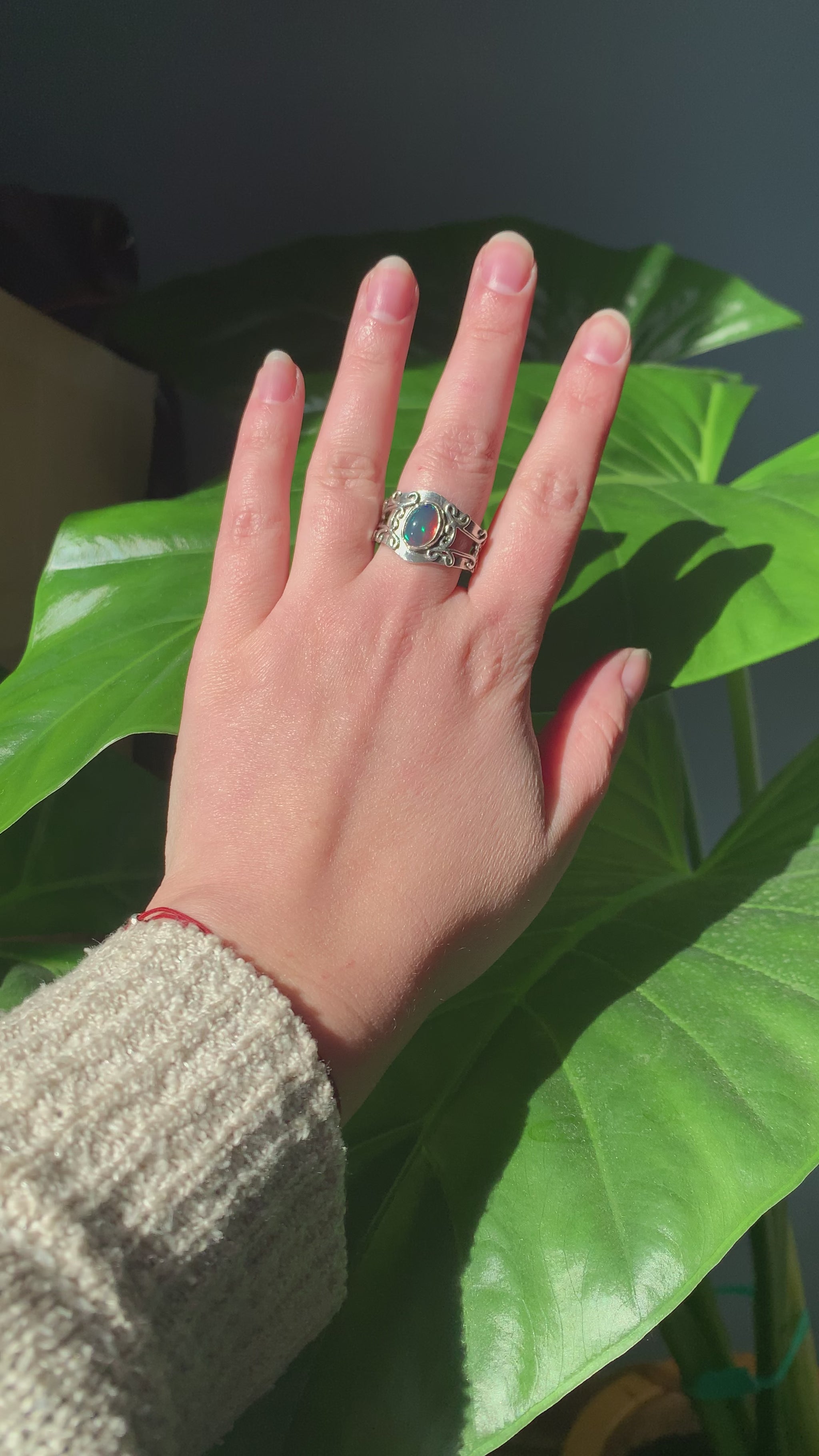 Inspirado en la década de los 20, este anillo tiene como inspiración el Art Nouveau que se caracteriza por sus curvas y formas orgánicas. Adornado con un ópalo etíope negro este anillo es ajustable y único en su tipo.