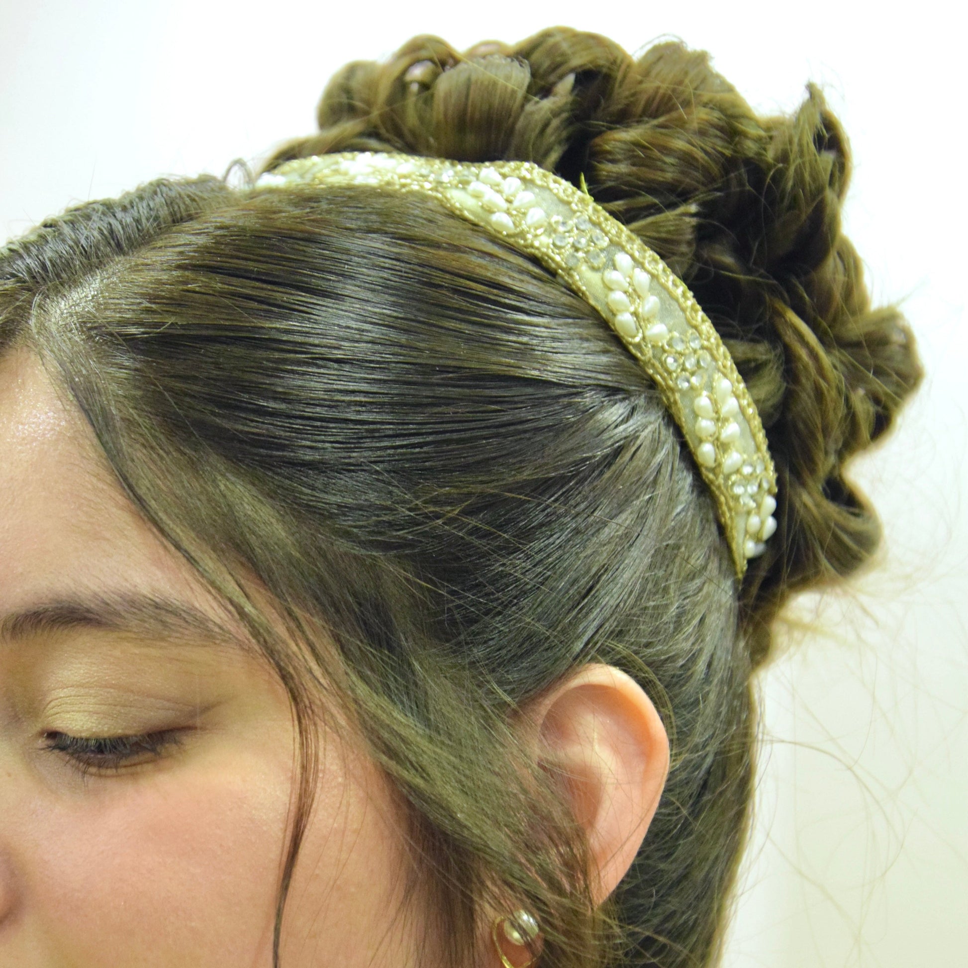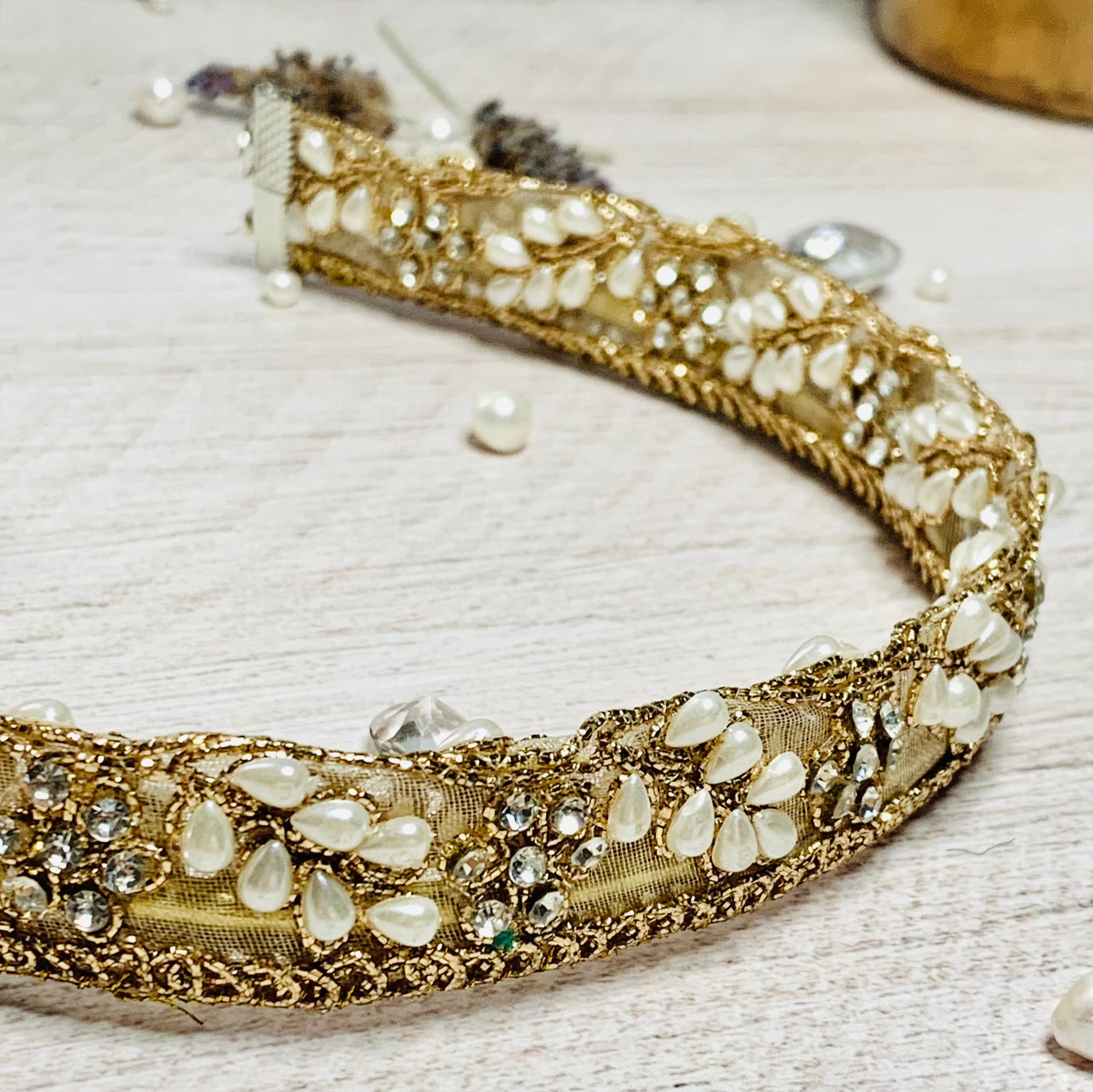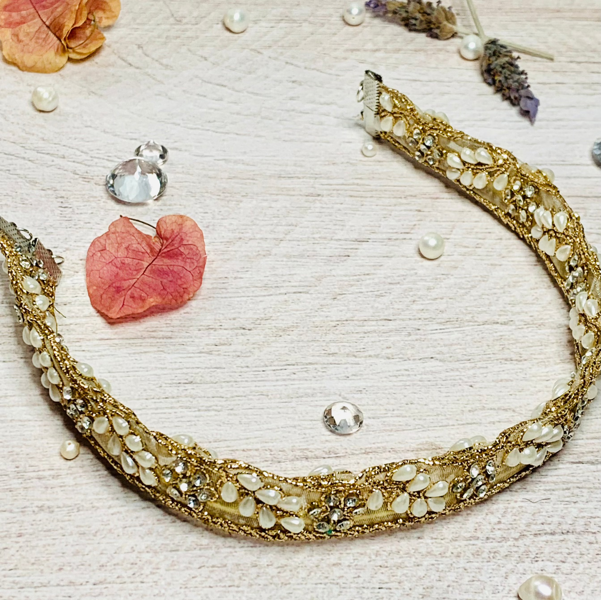 Cintillo confeccionado con alambre media caña de bronce y cinta con aplicaciones doradas y gotas de perla de fantasía.